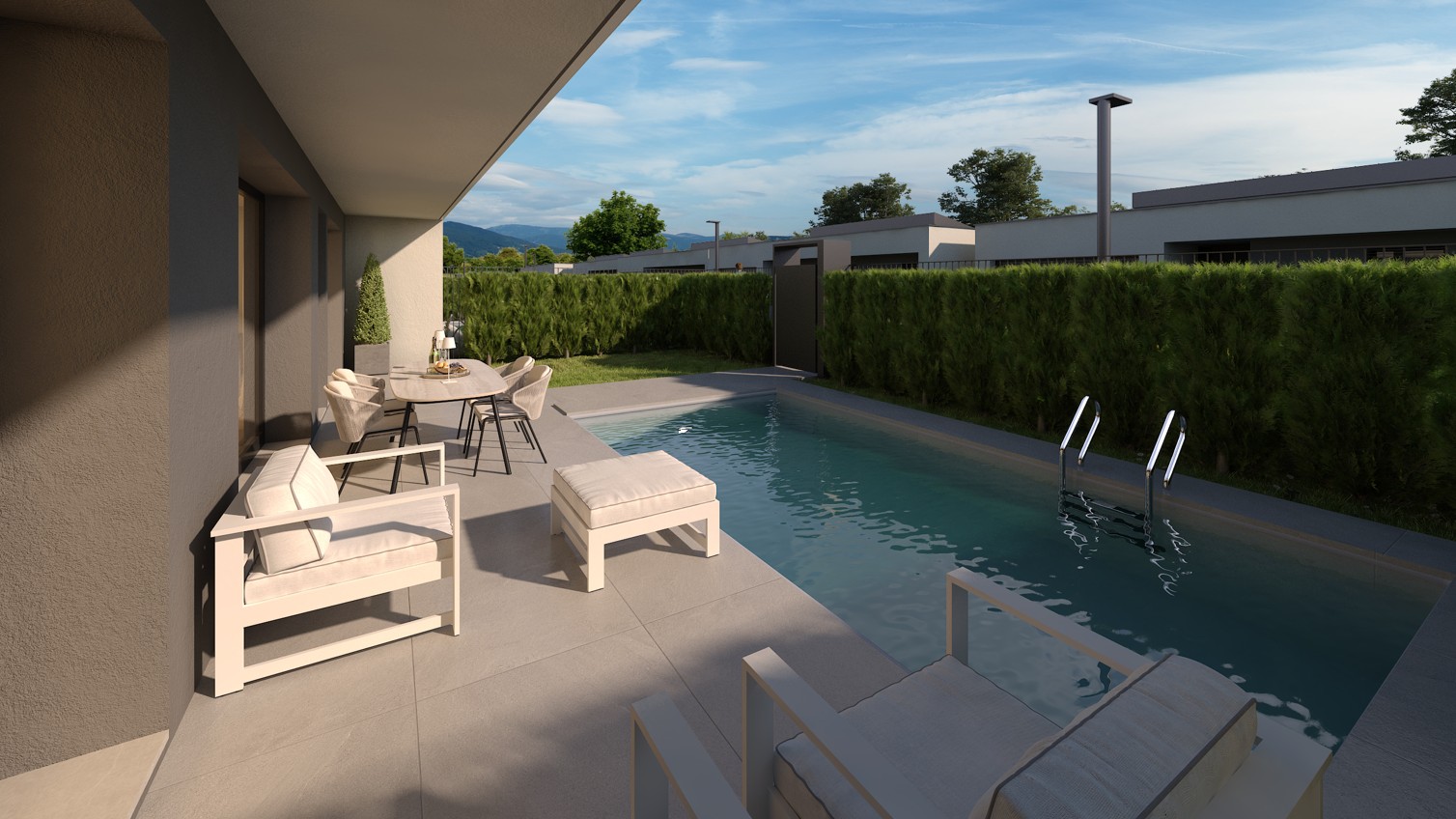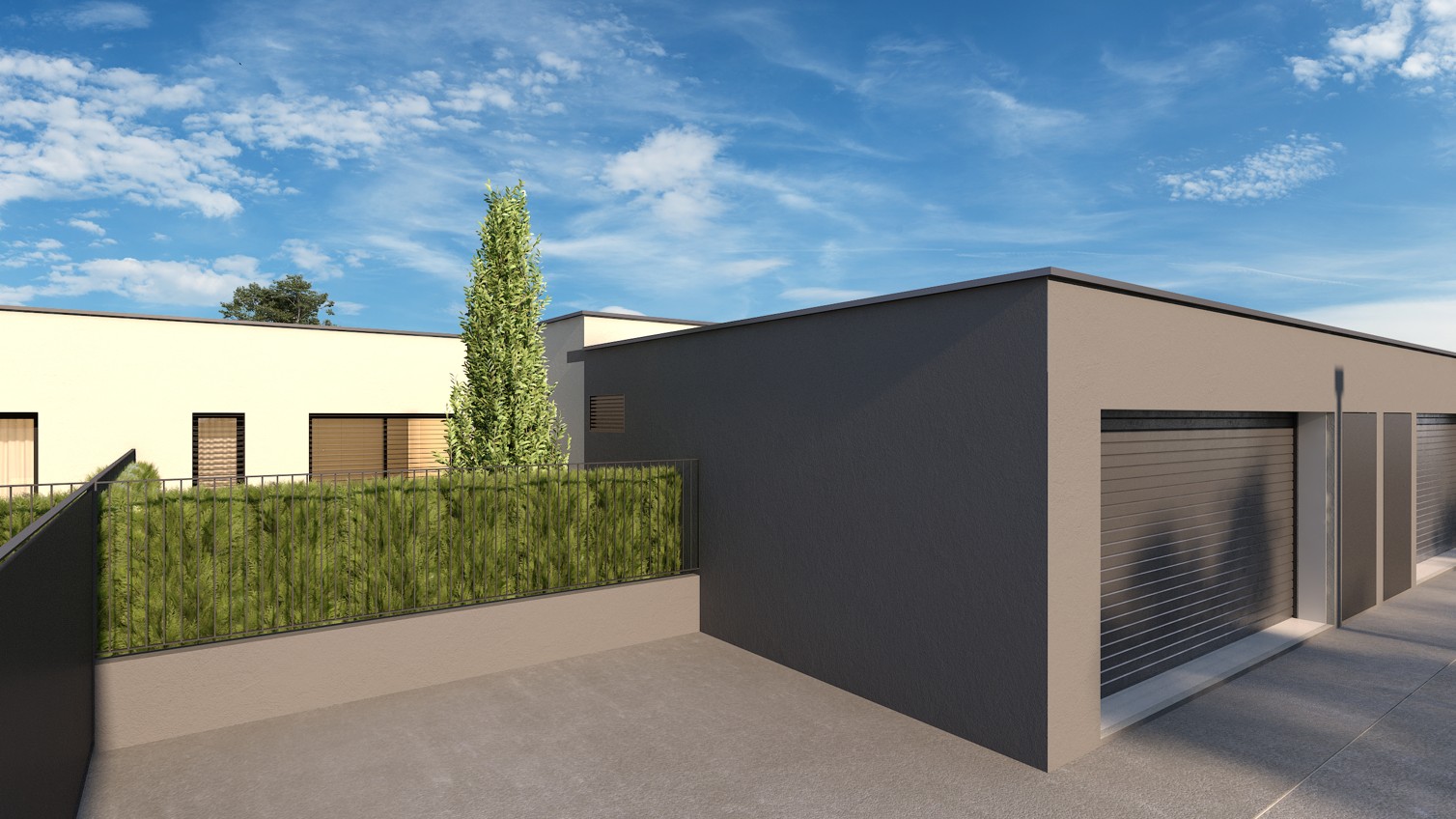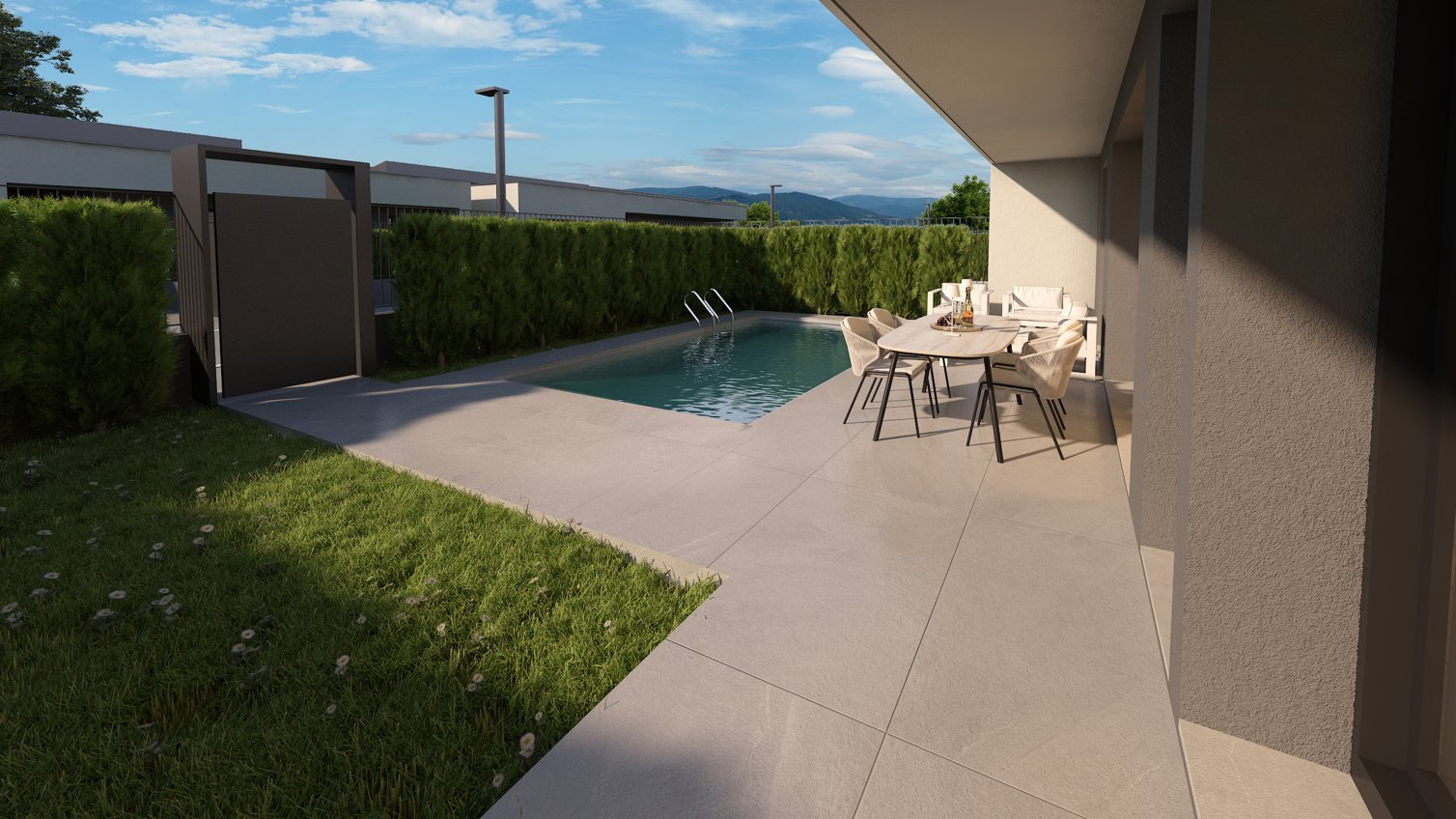 Villino situato al piano terra, con ampio giardino e spazio pavimentato esterno.